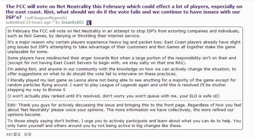 LOL延迟震惊美国政界?FCC发起net neutrality法案致力于网络宽带平等。