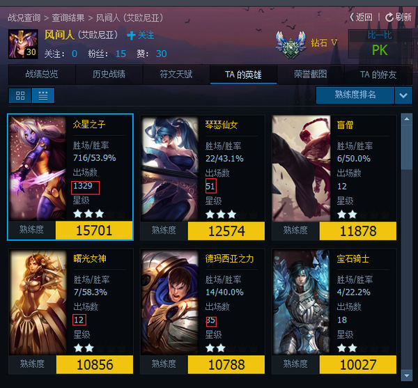 而查看此人战绩:电一钻石,专注辅助位置,精通所有辅助角色,但是只爱索拉卡一人,上赛季使用索拉卡1329场!