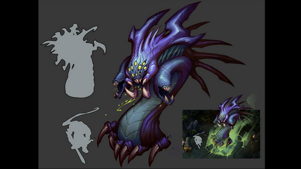 纳什男爵是我们为召唤师峡谷创造的初期形象之一。我们所有其他产品的生产模式几乎都是以它为参照。男爵的这种使用风格化但颇具攻击性造型的设计理念一直指导着我们创造其他的所有的形象,包括各种生物、岩石和植物。