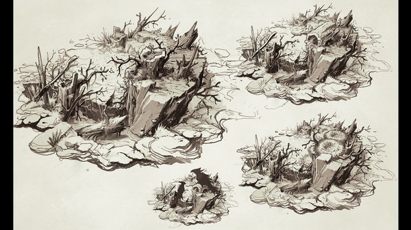 这些是最初拟画的北地区的地图。我们希望在男爵带来的灾难性影响下,这些地方的环境呈现出一种饱受摧残的效果。这些画很完美地展示了我们这个理念。