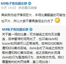 EDG对战M3的比赛更是因为比赛网络状况,EDG队员全体掉线,在9K经济的优势下被M3的小兵活活推掉了基地,赛后主办方认为M3违规推线因此判EDG获胜。赛后Dade发Facebook道出了比赛的输掉的原因