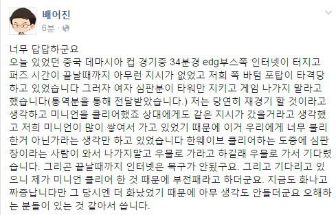 然后女子裁判告诉只守塔不要退游戏(翻译告诉的) 我当然想会重新开始比赛,然后就清兵了。 以为对方也受到同样的指示,而且我们这边小兵堆的太多所以只想着这是不是对我们太不利了。