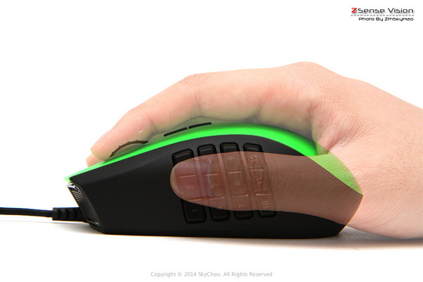 对于手掌在18CM或以上的玩家,完全的掌控新版那伽梵蛇是完全没有问题的,它是一只手感非常饱满的鼠标,背部比较高,所以基本上会选择完全趴握的方式,左侧的拇指键区每一个按键都有自己的角度,大大的提升了按键的辨识度。