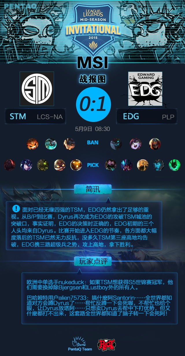 在5月8日MSI次日比赛中,由TSM对EDG,在短板Dryus再被EDG无情针对后,EDG顺利打开缺口,拿下比赛,将TSM理论上晋级的希望彻底粉碎。