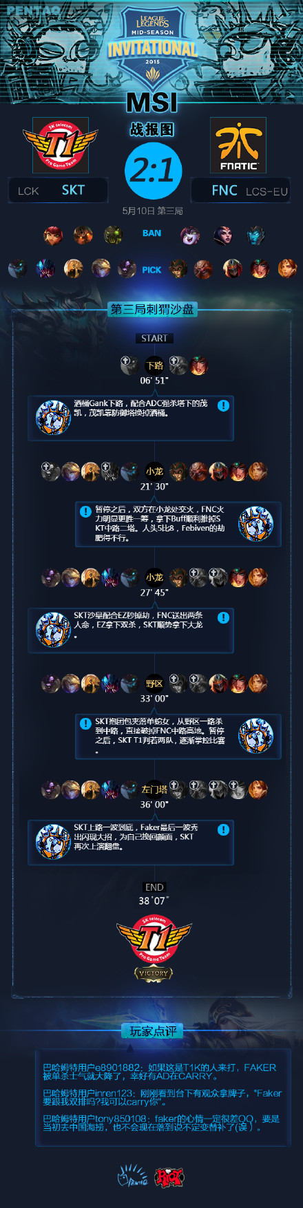 | 比赛时间 | 事件 | 人头(SKT:FNATIC) | 经济(SKT:FNATIC) | 推塔数 |