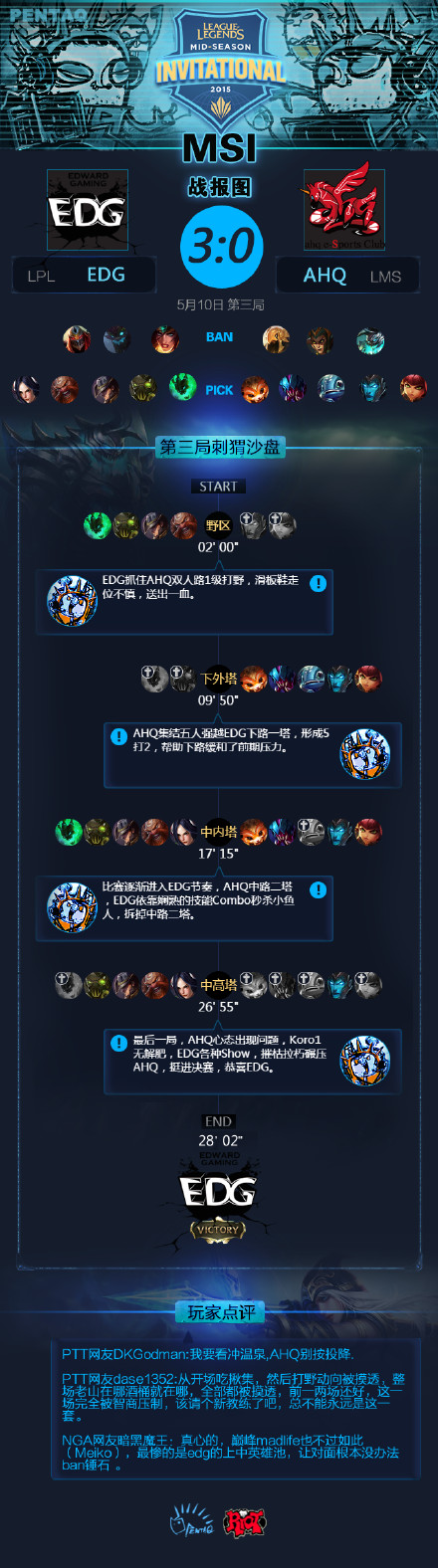 5月10日,MSI季中邀请赛淘汰赛第二局第三场,EDG以及其巨大的优势摧毁了AHQ,整个比赛和前两场比赛相突然的的画风一变,就像EDG在进行一场虐杀水友的匹配比赛,最终面对EDG的超神表现,AHQ毫无抵抗能力。