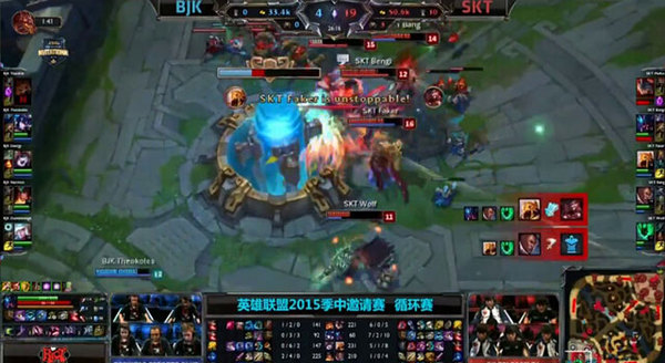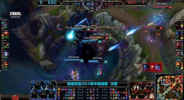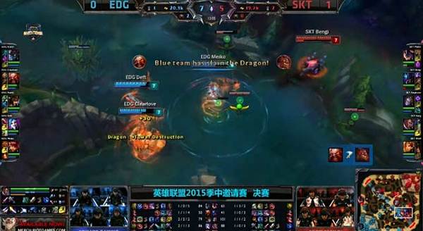 开局双方在SKT红BUFF野区遭遇,但是EDG一级团在先手上具有优势,SKT慌忙撤退但最终还是付出了三个人头的代价,EDG打出一个梦幻开局。蛇女回去直接掏出女神之泪,但是Pawn推线推的太凶了被兰博从后面包抄过来轻松击杀。随后EDG三人下去为Pawn复仇,安妮晕住配合大树捆住帮Pawn成功复仇。SKT与此同时四人上路逼进,金克斯和安妮在上路被击杀还损失一大波兵线。EDG开局的巨大优势慢慢被消磨掉,SKT还是慢慢稳住了自己的节奏。中路SKT又突然逼进中路,蛇女被迫交出所有召唤师技能,但是自己的位置也很尴尬,EDG的人又离的太远,等EDG的人赶过来时SKT已经杀到两人逃之夭夭。