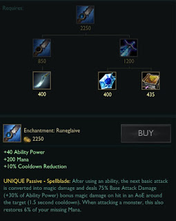 唯一被动-法术之刃:在使用一次技能后,下次普通攻击会转化为魔法伤害,对目标额外造成基础攻击的75%(+法术强度的30%)范围魔法伤害(1.5秒冷却时间)。当攻击野怪时,还会为你回复已损法力值的6%。