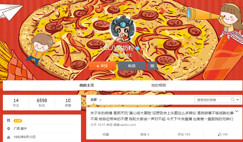 关于车的微博 是那天玩“真心话大冒险”没想到会上头题这么多舆论 是我做事不够成熟处事不周 给各位带来的不便 我和大家说一声对不起 今天下午会直播 也谢谢一直挺我的兄弟们