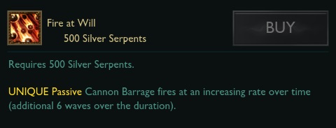 指挥普朗克的船队对指定区域发射12波加农炮,持续8秒。每波加农炮会造成50/70/90 (+0.4 AP) 魔法伤害,并在0.5秒内降低敌人移动速度30%。