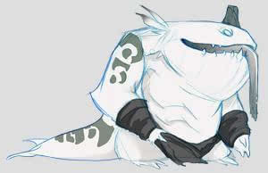 从定位来说,坦克英雄通常会为队伍带来以下这两方面之一的作用:要么像阿木木/瑟庄妮一样把敌人全都定在原地,好让队友接上一连串的技能;或者是凭借自己连续的控制让对面最有价值的目标动弹不得(比如蕾欧娜放大再接上EQ二连);又或者是这个坦克将对手抛/拽到队伍当中(辛吉德,沃利贝尔,斯卡纳)。我们需要解决的难题在于,塔姆肯奇是个没有上述任何一种功能的坦克英雄,但他能够为己方带来一些完全不同的东西。美工团队的家伙们画了些草稿,很快我们就开始喜欢上这个大嘴巴的生物了。这对我们来说是一个重大进展,受到他外形的启发,我们迅速想出与外观有联系并且在游戏当中前所未见的技能:大快朵颐。