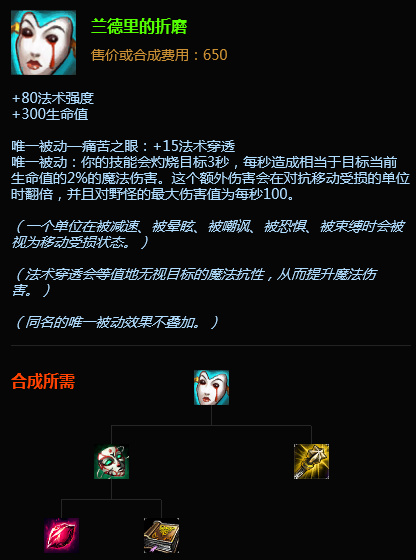 刚出来的时候中单英雄几乎人手一件卢登,后来不停削弱仍然无法撼动它的地位。但这一次已经削到了它的根本,当然作为法系电刀的特性还是没有变。对于那些缺乏清兵能力的英雄来说,卢登仍然是一个可选装备。