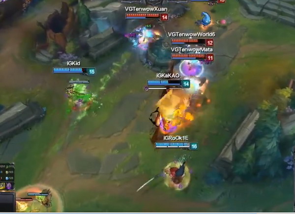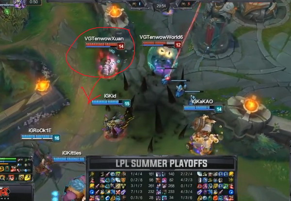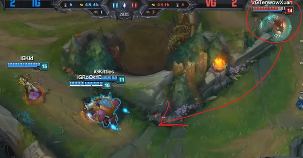 此时瑞兹有tp而璐璐有加速已经在往上路跑了,LGD忌惮发育良好的薇恩于是回城防守。虽说没有什么中立资源可以争夺,但是人马的TP还在cd,这一点VG是知道的。总之红叉已出,所以VG很确定这场团战可以打,所以他们在这里设下陷阱,即使有璐璐迟到和薇恩被秒的风险。