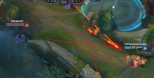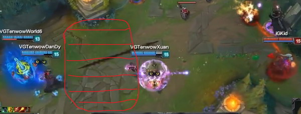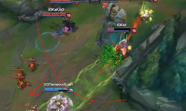这里大嘴在追凯南和维克多,但是当大嘴靠近没有VG视野的地方时他果断停下来,并且回头。画出的地方是没视野的,所以没必要深追,这次耗血已经有优势了。