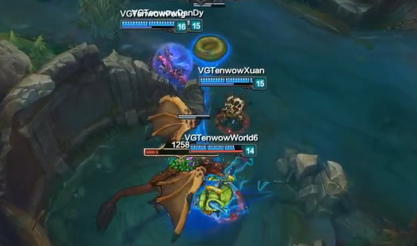 这是一个相对比较合理的围攻。薇恩套盾并且点塔而布隆在区隔右方的敌人。璐璐和瑞兹在后面保护薇恩。但是问题是努努离的太远了,而且瑞兹和璐璐站在死胡同里并且都离薇恩太近,有被AOE的危险。