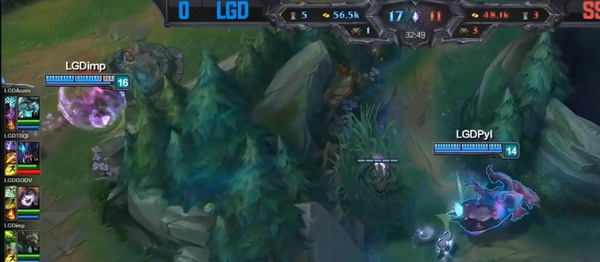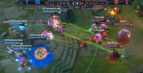此时经济差已经到了14.5k了,IG有大龙buff而且巨大的经济差使他们决定对下路进行围攻。但是变身超级赛亚人战术完全可以用来守塔,发育良好的ADC足以让任何可以攻击到塔的敌人退却,而趁这个时候,他的队友开始清线。这就使得对手的推塔节奏难以推进,最后分推战术就会取得优势。