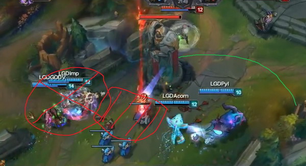 这个例子并不理想,因为璐璐和大嘴站的太近,几乎是在告诉对面快点AOE我俩吧。而纳尔和巴德的站位有些靠前可能会被开,这一次是没什么,因为对面是想TP后方开团而不是正面开,但通常来说这样的站位围攻是很危险的。