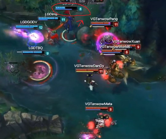 然而LGD感觉似乎他们投入了太多来杀薇恩结果还没杀死,于是他们又加大投注,不杀努努而开始集火薇恩,甚至交出闪现来拉近距离,这场战斗过后,薇恩阵亡但是人马也阵亡了,最终VG三换四。