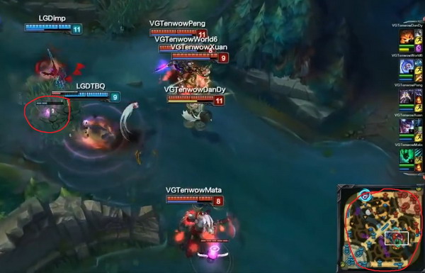 在开团失败后VG想走,但是他们已经追的太深了,所在位置十分尴尬而且所有队员都集中在一个死角刚好可以被老鼠扫射,而且敌方人马也可以单传到后面,团战位置非常糟糕。璐璐和瑞兹就站在老鼠前面被打,而薇恩在墙后打不到任何人。这场团战LGD二换五取胜。