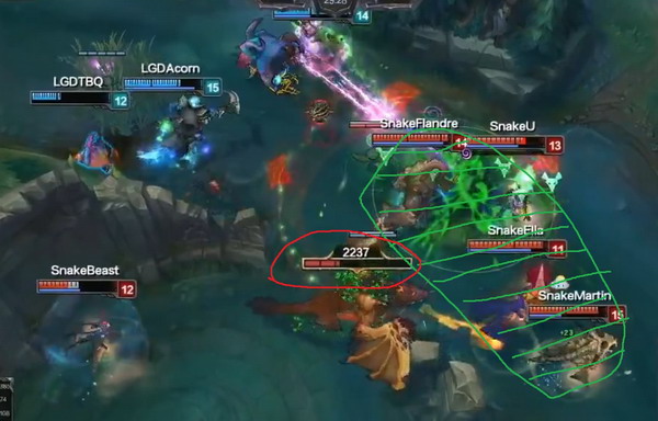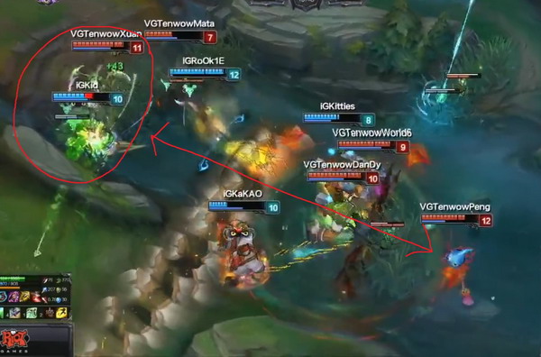 VG在之前赢下团战并且想要在这之后速拿小龙。但是IG决定3v5防守,当然巨魔正在赶来所以是一场潜在的4v5团,但是注意绿色区域中几个人靠的多近,那里是输出龙的最远距离,但是绝对是个很烂的站位,因为璐璐应该站在红圈所在的位置来防止敌方骚扰或者直接5v3开打,结果VG选择速拿小龙。