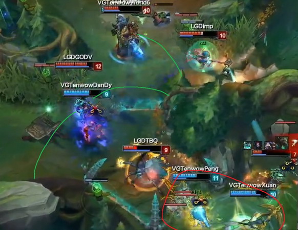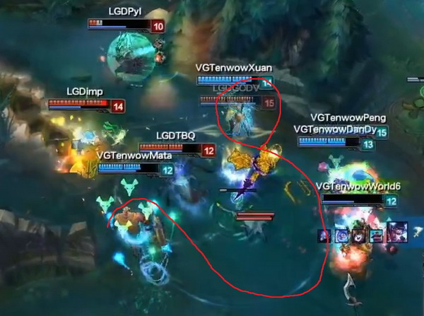薇恩被开就注定敌方会集火她而忽视了努努,这让VG利用了地形优势来让努努在中央开大而瑞兹就在其侧,这使得LGD五人不能全员追击薇恩。同时璐璐站在薇恩身旁保护她并且一起放对面前排风筝,而LGD的后排又不得不处理努努。
