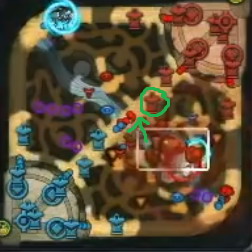 布隆闪现大招击飞3人,通常来说这个开团堪称完美。但为了跟上老鼠和璐璐,不得不走出图中红色标出的不利地形处。即使巨魔没有在那里放柱子,或许他们的站位会好点,但是如果璐璐和老鼠都想在对方扎堆的时候打出伤害的话,他们就必须站在那里。