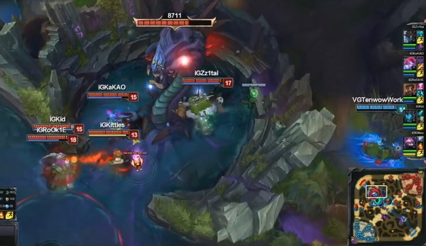 VG还成功的杀了来偷大龙的蜘蛛,这更确立了5v4的优势。但是他们现在就陷入了狭小地形,而且如果没有布隆挡掉老鼠的大招,在AOE之下无处可逃的他们肯定要被团灭。