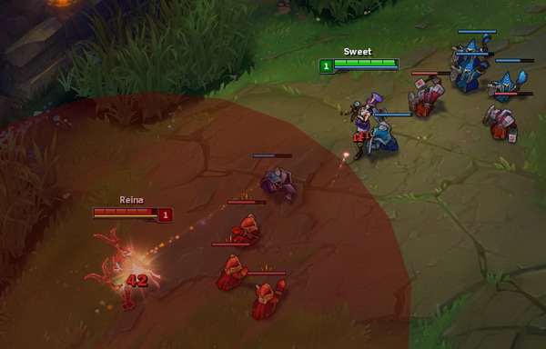 举个例子,这个话题丝毫没有提及我们为近战对线英雄提供的‘仇恨机制’。现在有一个以攻击者为中心的第二反应圈,在你被迫远离兵线时仍能使己方小兵切实作出反应(对远程攻击者尤其有效)。”