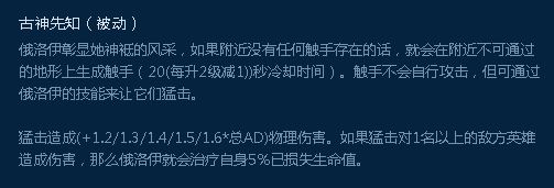 解析:每隔一定的周期就能在俄洛伊的周围墙壁上生成触手,如果已经有触手了就需要间隔一些距离才能生成。触手是不可控制的,也不会自动攻击,但是可以通过俄洛伊其他的技能来进行互动,造成猛击。猛击的伤害非常的高,如果对一名以上的敌方英雄伤害,还可以治疗俄洛伊。