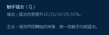 解析:Q技能的被动效果可以提升猛击的伤害,也就是提高触手攻击人时的伤害,主动施放的时候以俄洛伊自身为起点,向前方挥舞触手进行猛击,而不是利用周围墙壁的触手攻击。请不要被文字说明误导了,你可以简单的理解为一个单纯的AOE技能。