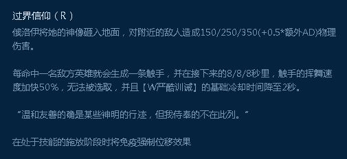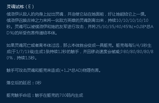 解析:俄洛伊的招牌技能,让她对线期可以1打2,后期团战能1打5的存在,对附近敌人造成伤害,同时每命中一个敌人就可以生成一条触手,命中灵魂也可以生成的,并且在接下来的8秒内,触手的挥舞速度会增加50%,还不会被敌人A掉。这样还不算暴力,当开启大招后的时间里,W技能的基础冷却会降低到2秒,也就是说,当你拥有40%的冷却,W只有1.2秒,8秒内可以放好几个W,触手就能啪啪啪的持续造成伤害。还有一点是在技能中没有给出说明的,那就是多条触手对同一个目标造成伤害,除第一条触手外后续的只造成50%的伤害。