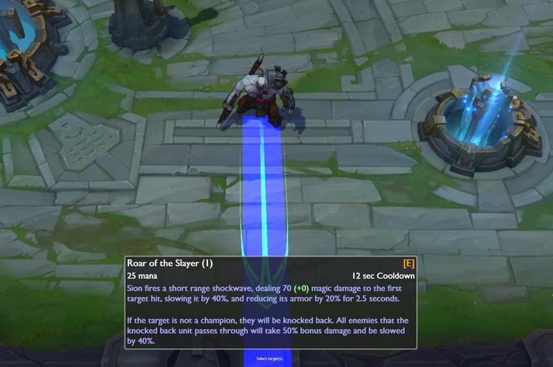 赛恩朝指定方面战吼,对第一个击中的敌人造成伤害,并有减速、护甲穿透效果。如果该技能击中敌方小兵或是野怪,还会击退他们一段明显的距离。被击退的小兵或是野怪,碰到其他敌人时,还会对他们造成伤害以及减速效果。